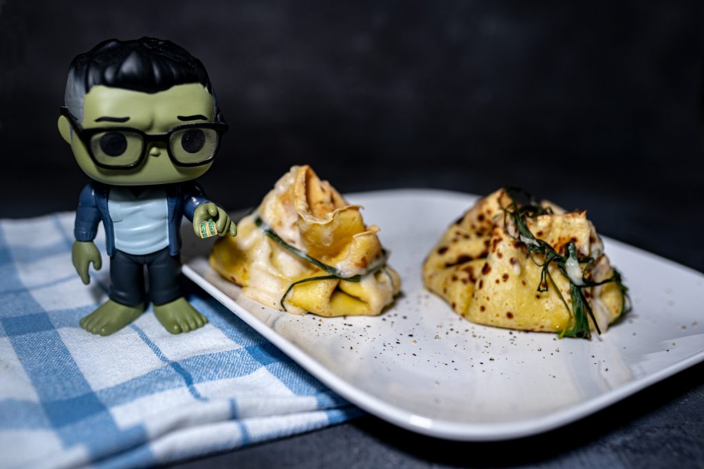 - Na każdą sakiewkę wykładamy trochę beszamelu. Wkładamy do piekarnika i pieczemy w 180oC przez 20 minut.